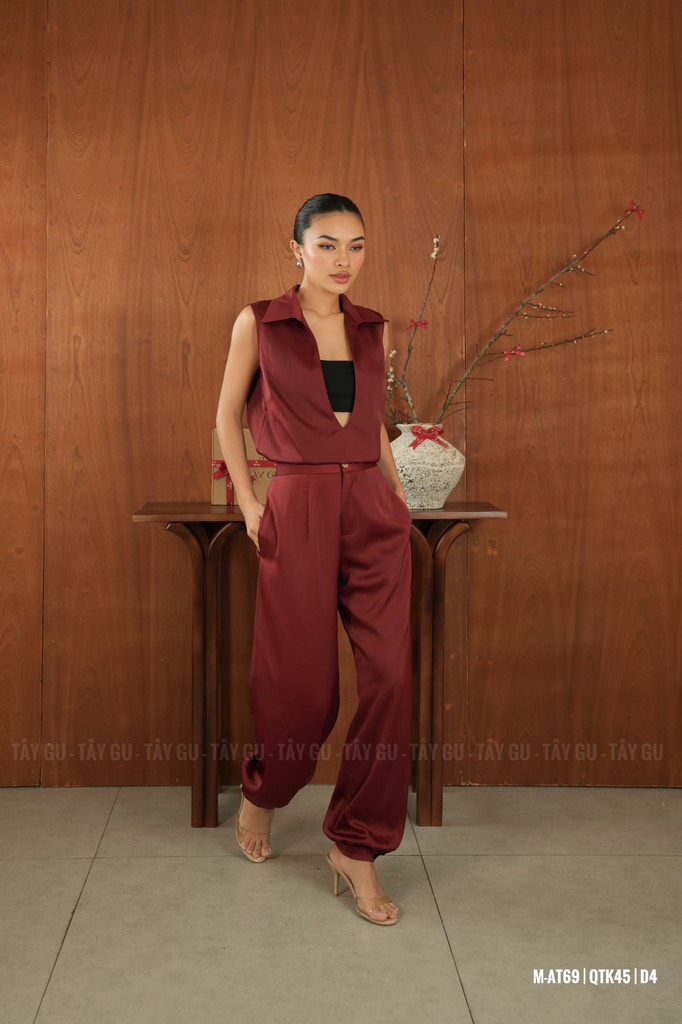 Áo ERA – AT69 là thiết kế lụa cổ V sát nách mang tinh thần nữ tính và thanh lịch hiện đại. Gam đỏ nổi bật giúp tổng thể trở nên cuốn hút, tôn da và tạo điểm nhấn ấn tượng nhưng vẫn giữ được nét tinh tế đặc trưng.