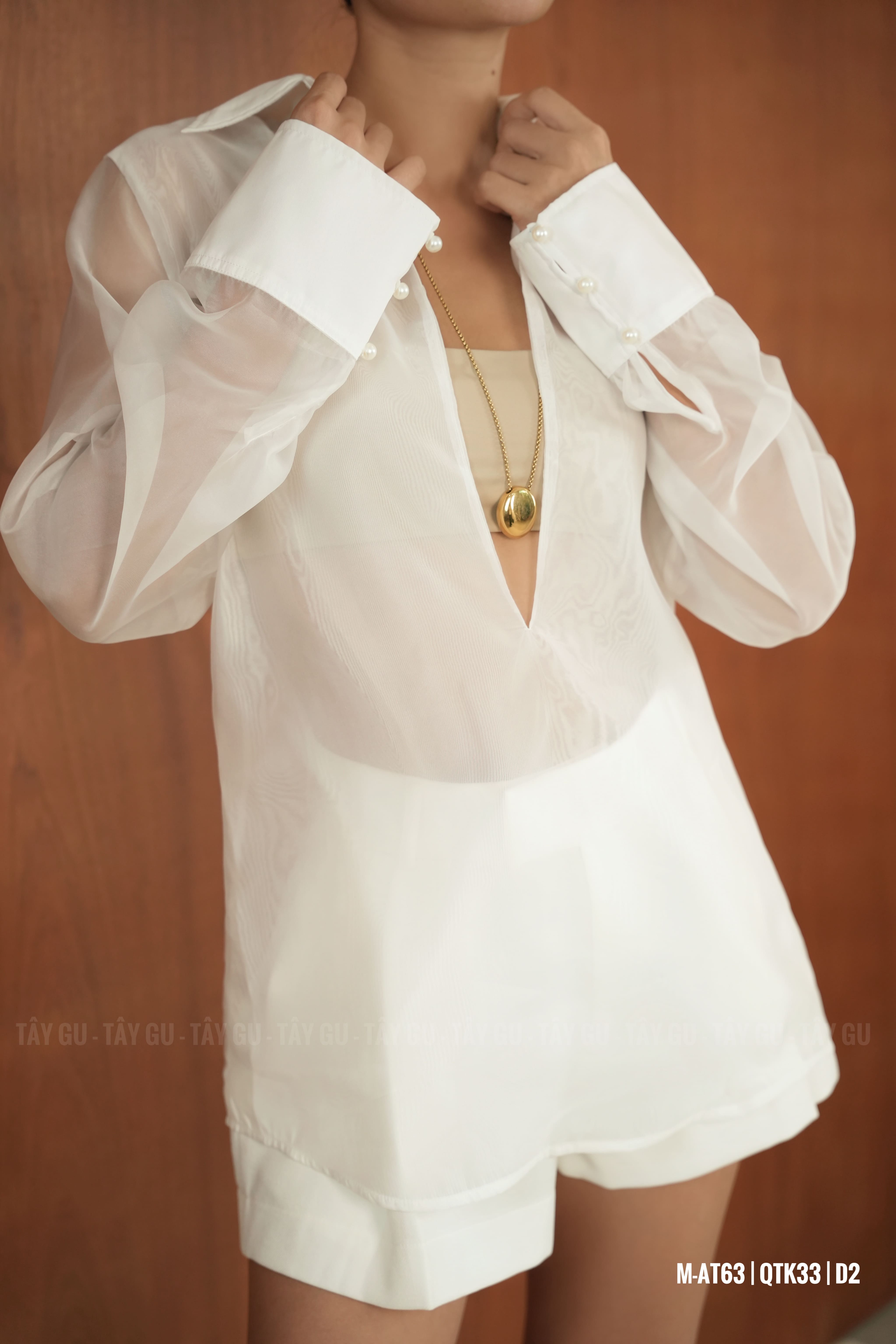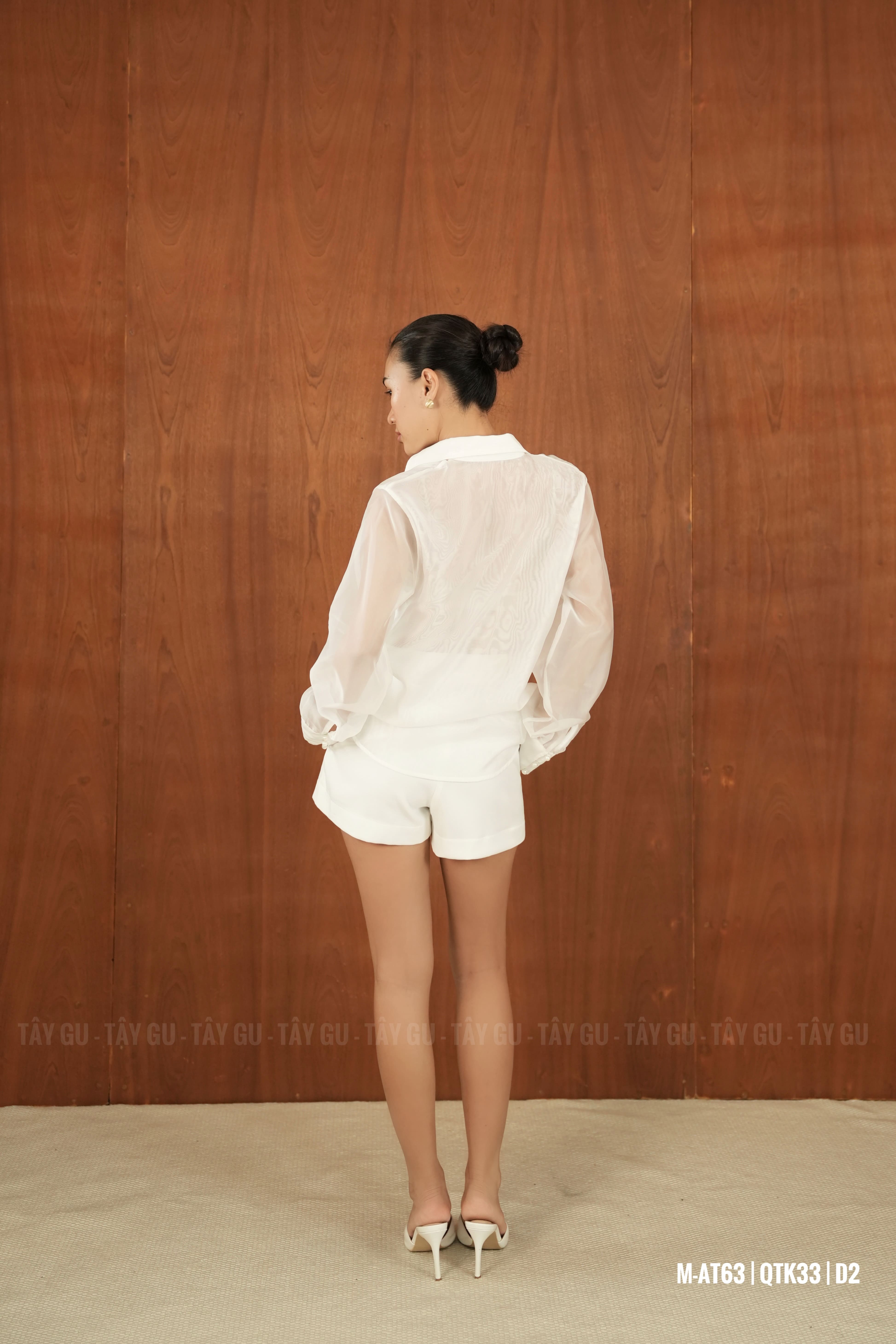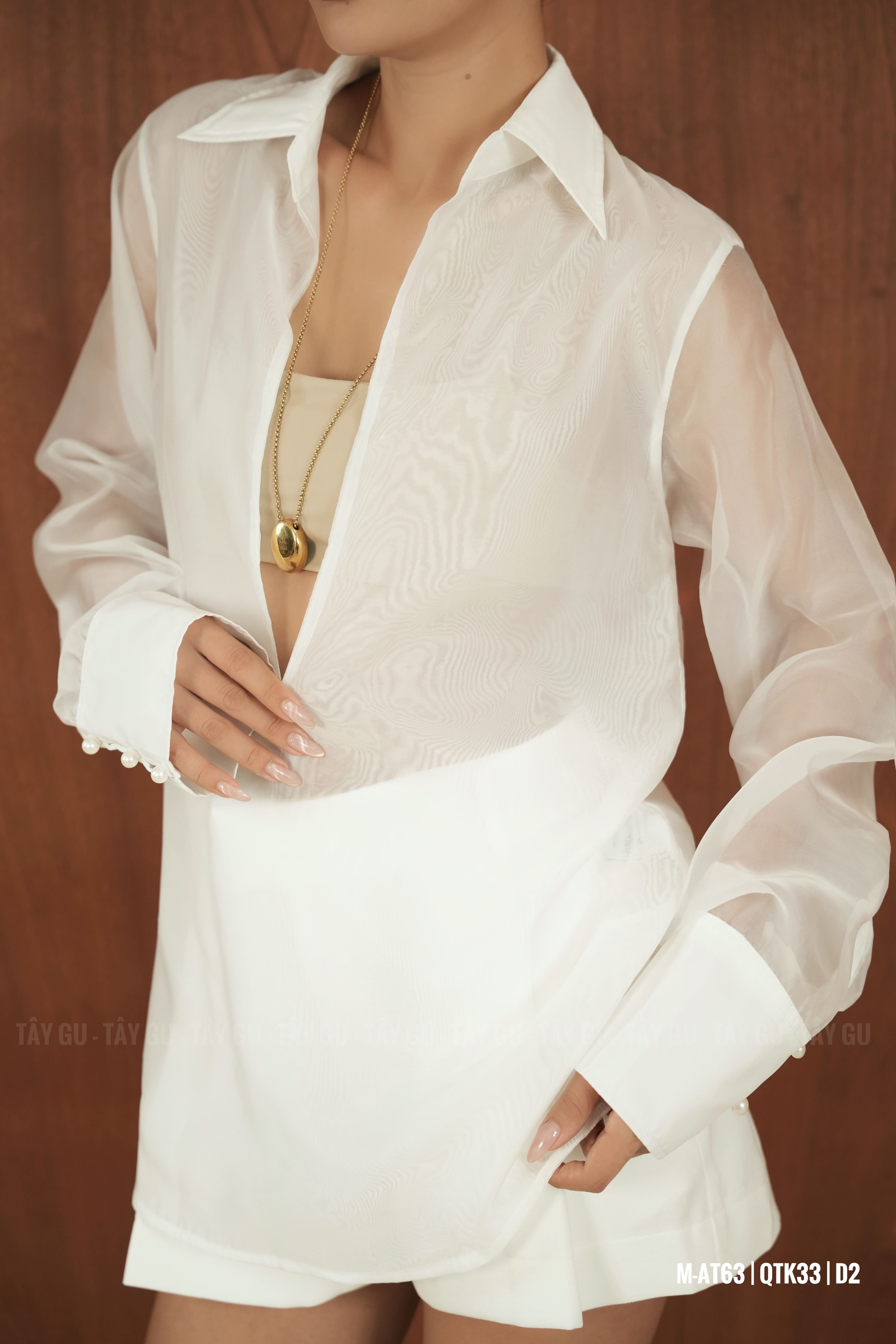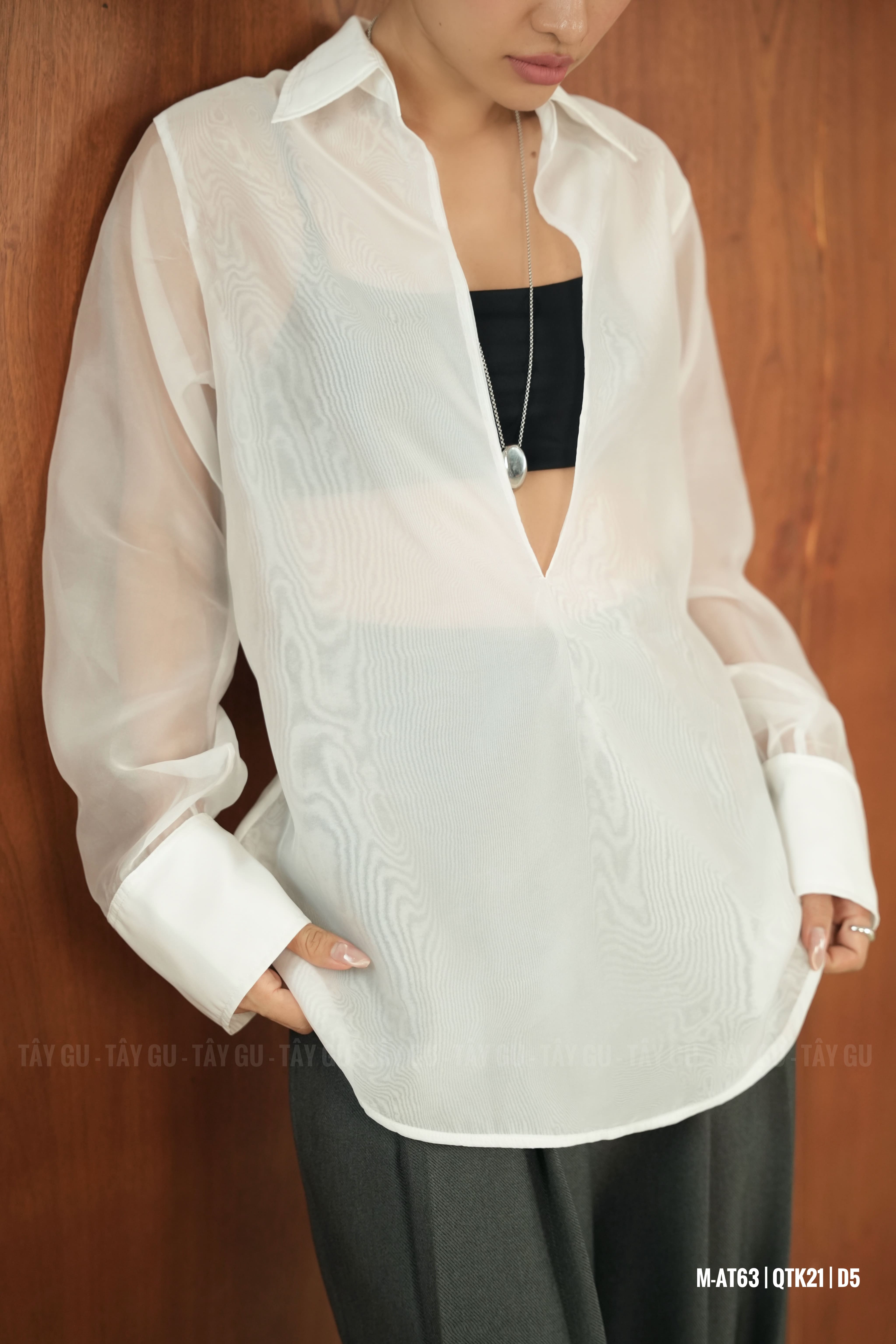 Áo PERO – AT63 là thiết kế sơ mi voan trắng với chi tiết cổ xẻ sâu tinh tế, mang lại vẻ đẹp nữ tính nhưng vẫn giữ được sự thanh lịch. Gam trắng tinh khôi giúp tổng thể trở nên nhẹ nhàng, dễ phối và phù hợp trong nhiều hoàn cảnh.