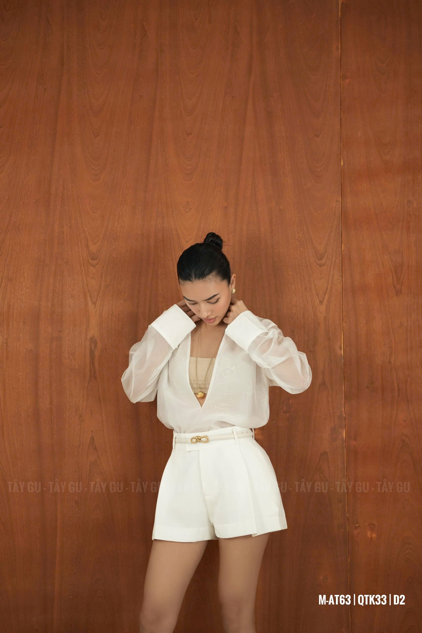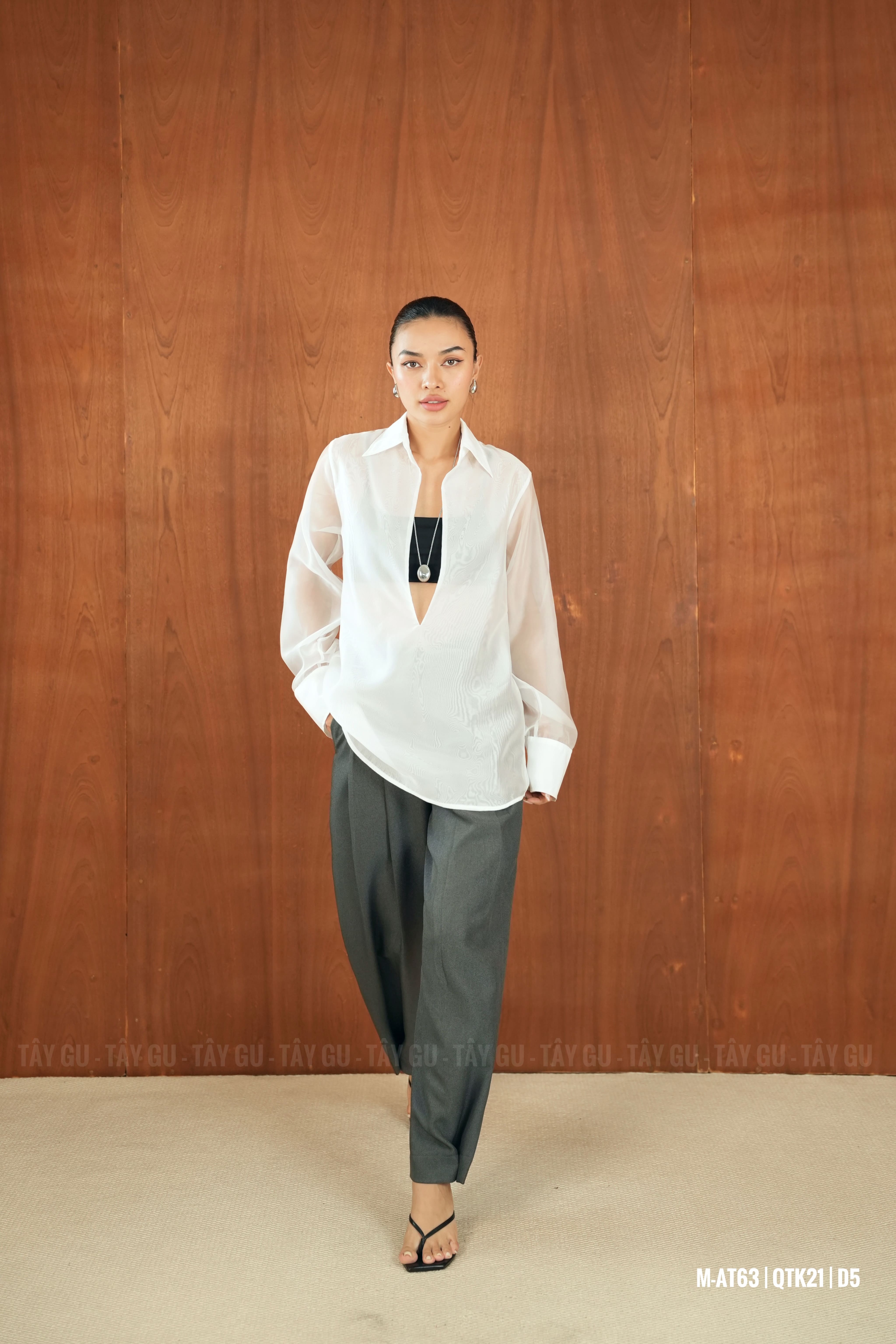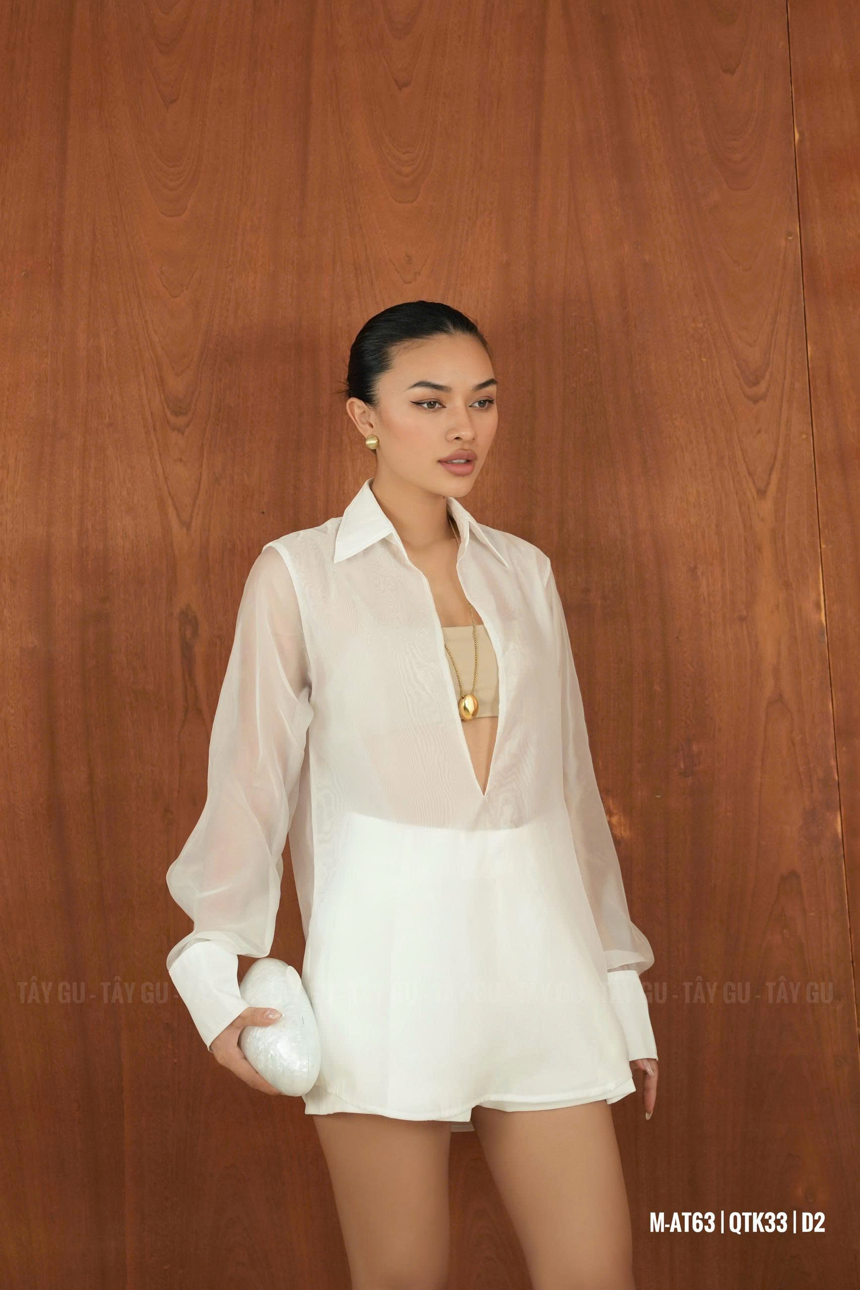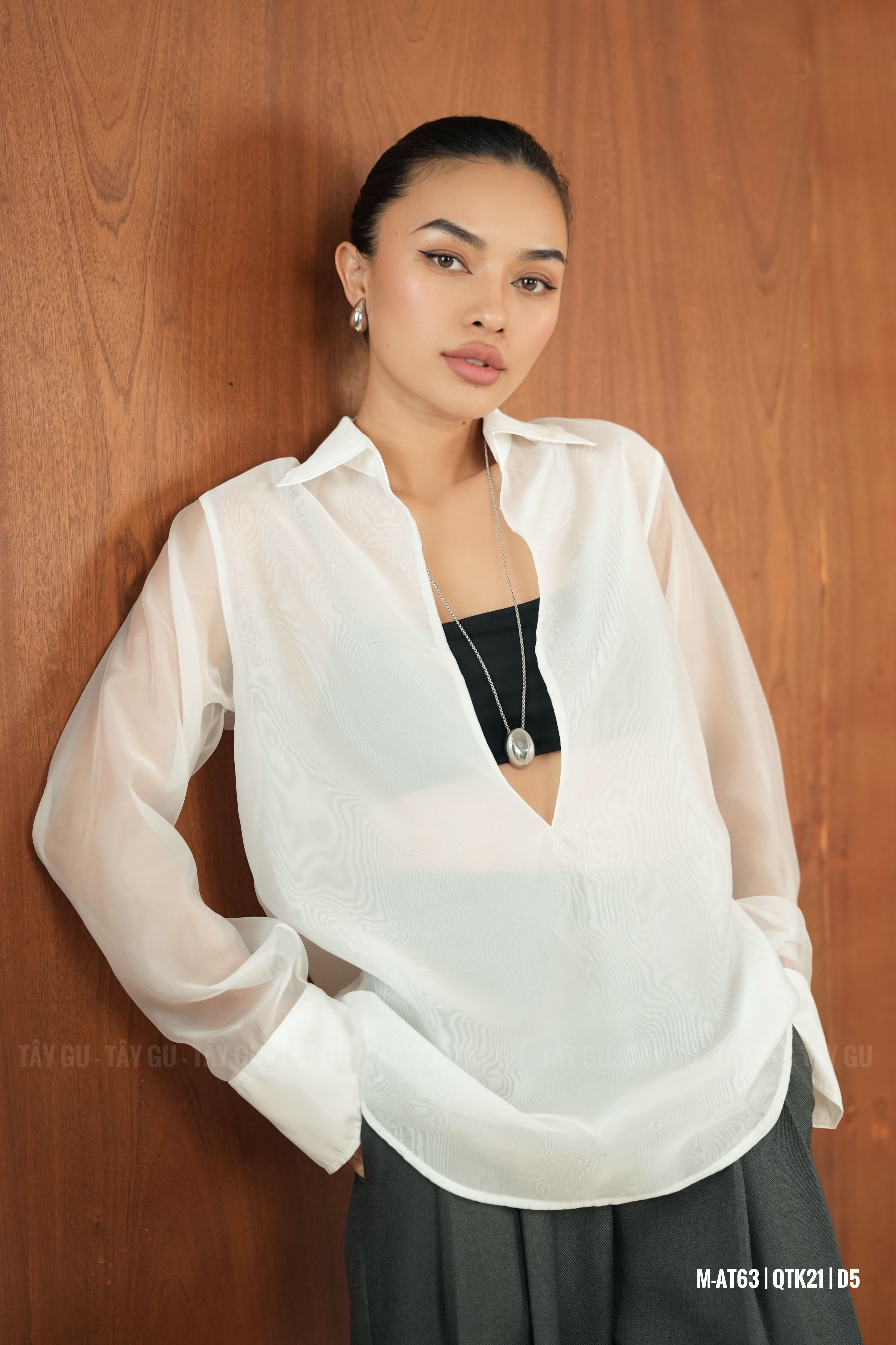 Áo PERO – AT63 là thiết kế sơ mi voan trắng với chi tiết cổ xẻ sâu tinh tế, mang lại vẻ đẹp nữ tính nhưng vẫn giữ được sự thanh lịch. Gam trắng tinh khôi giúp tổng thể trở nên nhẹ nhàng, dễ phối và phù hợp trong nhiều hoàn cảnh.