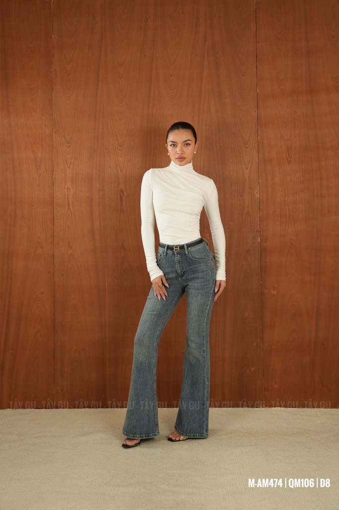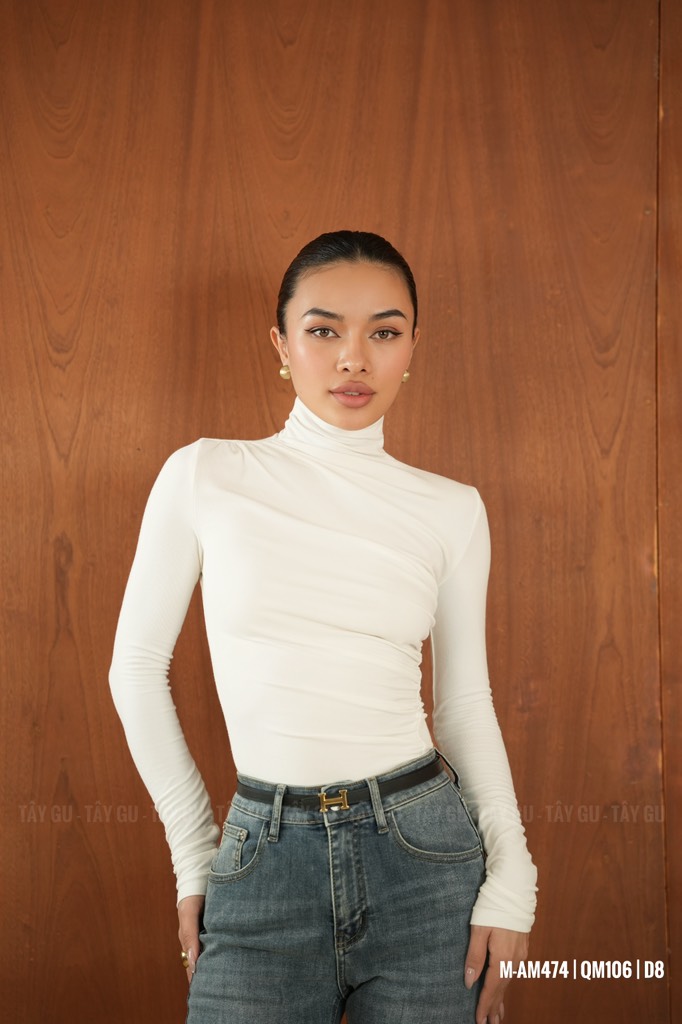Áo AM474 là thiết kế thun tay dài cổ lọ thấp kết hợp chi tiết nhún vai và eo, mang lại vẻ ngoài nữ tính nhưng vẫn giữ được nét hiện đại. Phần cổ lọ thấp giúp tổng thể trông thanh lịch, trong khi chi tiết nhún tạo hiệu ứng tôn dáng rõ nét.
