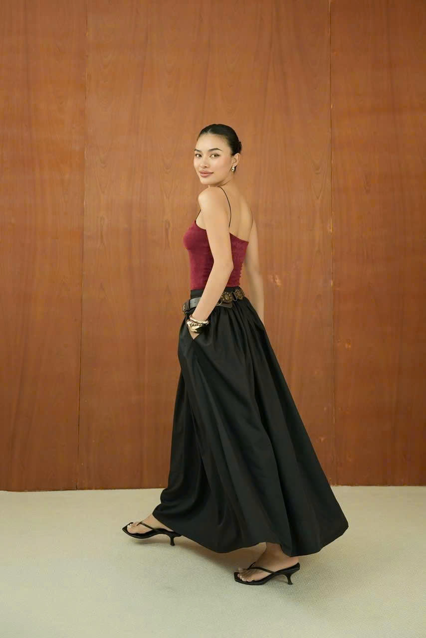 Có thể phối thêm túi mini và phụ kiện ánh kim để hoàn thiện outfit.