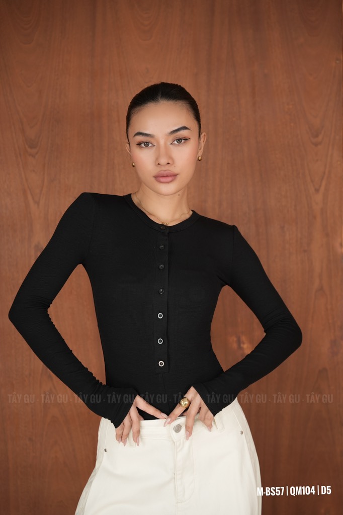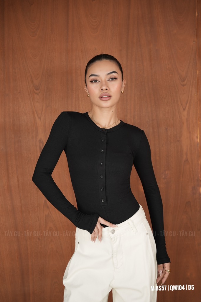 Bodysuit BS57 là thiết kế tay dài cổ tròn kết hợp chi tiết 7 nút phía trước, mang tinh thần tối giản nhưng vẫn có điểm nhấn tinh tế. Phom ôm vừa cơ thể giúp tôn dáng gọn gàng, tạo hiệu ứng chỉn chu khi phối cùng quần hoặc chân váy.