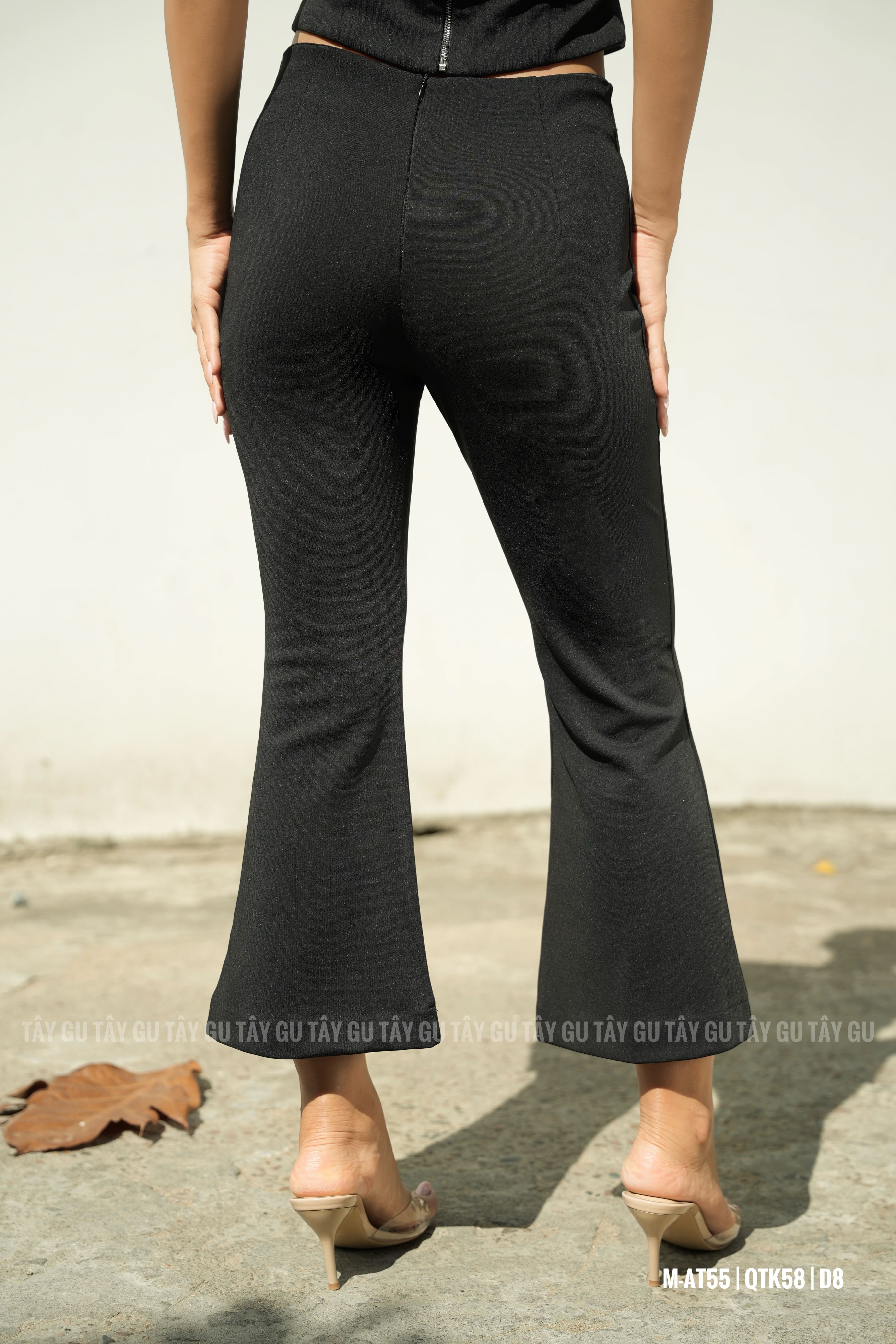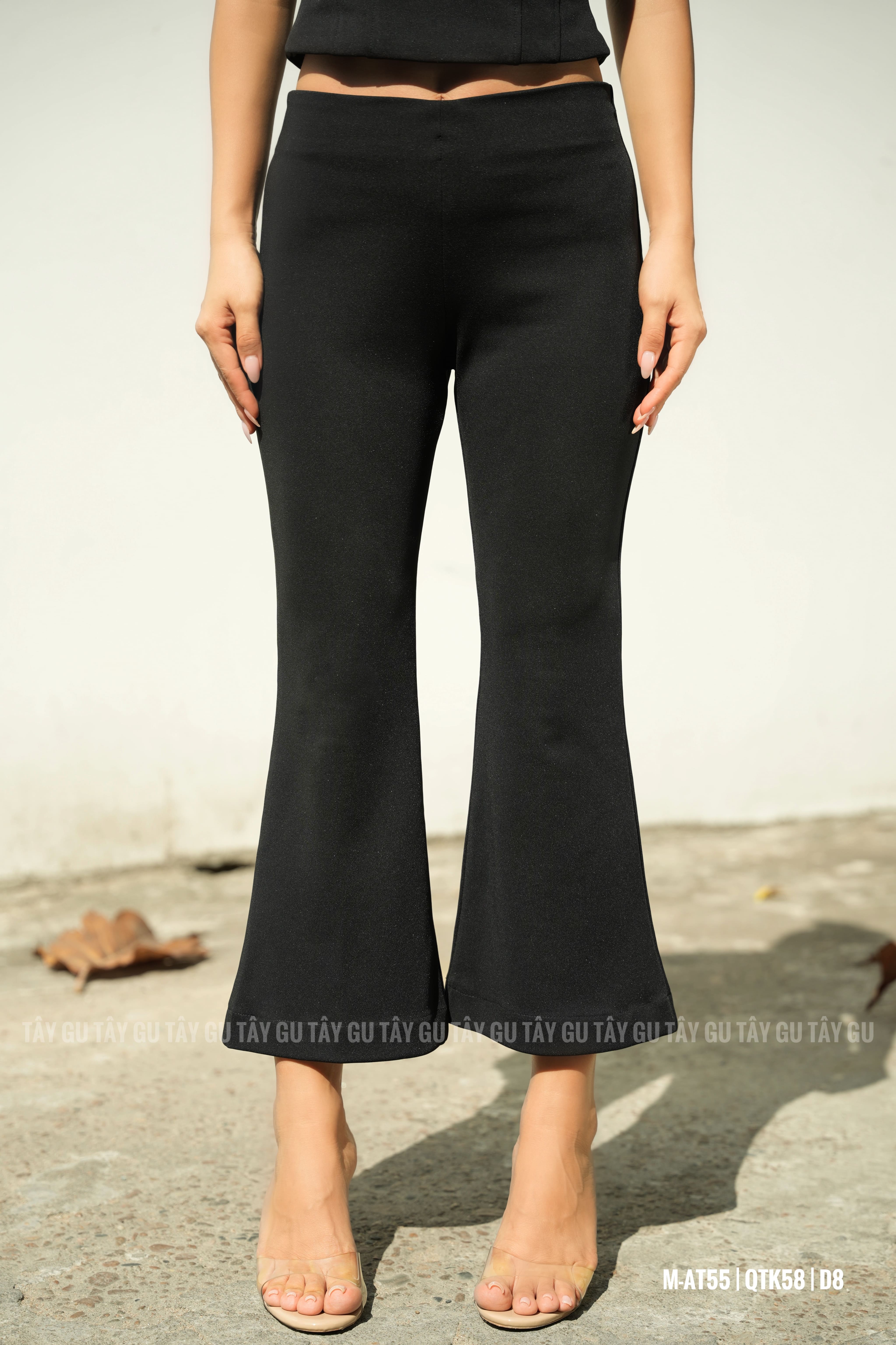 Form ôm nhẹ phần hông và đùi, loe dần ở ống tạo hiệu ứng cân đối vóc dáng. Độ dài lửng vừa phải giúp outfit trông thanh thoát, không bị nặng nề. Chất thun co giãn mang lại cảm giác thoải mái, linh hoạt trong suốt quá trình mặc.
